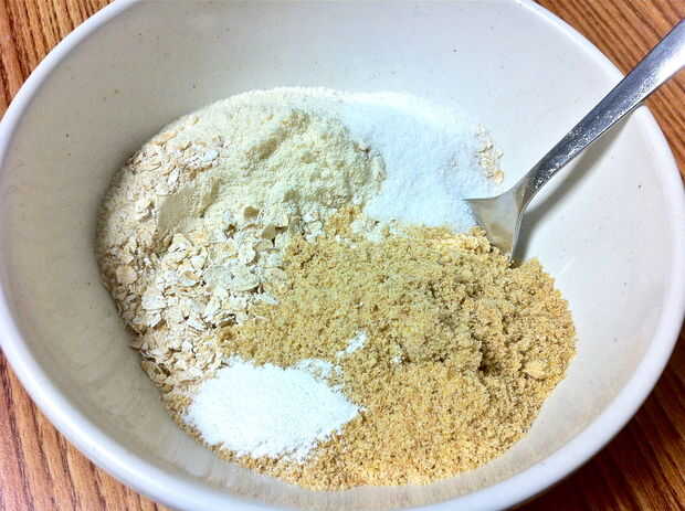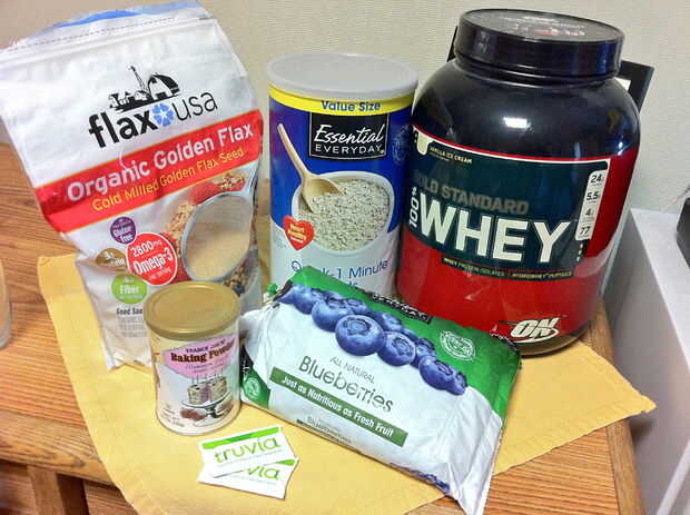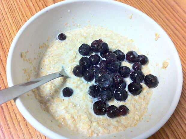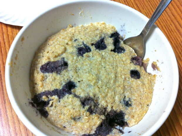 En un bol para microondas [muy], mezclar todos los ingredientes secos y añadir suficiente agua para que combina. Luego añadir un poco más. Agregue sus arándanos y microondas en medio alto por 5 minutos.