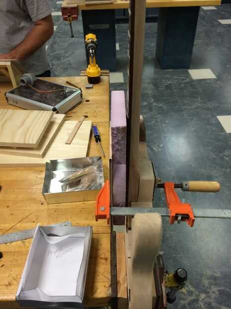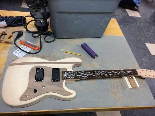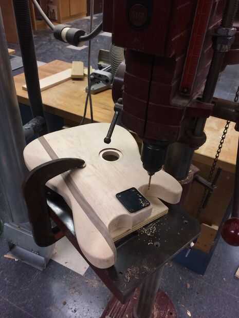 Ahora la guitarra se parece a una guitarra, probablemente has puesto en su regazo y aire ensamblada lo menos 5 veces ahora, permite añadir un cuello a la. Espigado en el cuello es bastante recta hacia adelante. La parte más difícil se ha hecho al encaminar hacia fuera de la ranura. Muchas guitarras no tienen un cuello plano, a menudo ángulo de nuevo unos pocos grados más o menos. La ranura del cuello podría reducirse en ese ángulo exacto o podrían añadirse cuñas para lograr ese ángulo. No estoy totalmente seguro de lo que quiero, por lo que aburre un ½" agujero en la parte central posterior de la ranura del cuello utilizando un forstner para colocar un taco de ½" o perno así que puedo ajustar el ángulo del cuello. He comprado una placa de cuello de stratocaster de fender que vino con mi cuatro tornillos y una placa de plástico. Vas a querer colocar la placa centrada en el área de la ranura. Hacerla igual de ambos lados y el borde y la parte posterior de la ranura. Luego trazar donde los agujeros deben utilizar la placa en sí. Ahora queremos taladrar orificios para los tornillos. Recomiendo usar un taladro, si está disponible; perforar directamente a través del cuerpo es crucial. Después de taladrar los orificios piloto, sujete el cuello al cuerpo en su lugar. Puede perforar agujeros en la parte posterior del cuello también en ese momento utilizando un taladro de mano a través de los orificios piloto que ya ha perforado. Para sujetar el cuello, pongo un trozo de espuma y masonite sobre el tablero del traste y una toalla de papel sobre la placa metálica, luego una pinza c sujeción todos juntos. La espuma, Masonite y toalla de papel son sólo para protección contra presión y arañazos. Una vez todo en su lugar y derecho, engrasar los tornillos y atornillarlas. Usé un destornillador en vez de taladro de la mano porque era algo fácil atornillar en una vez que fueron engrasados y los agujeros fueron perforados. Una vez su apretado, retire la abrazadera y limpie el exceso de grasa. Ahora se siente realmente como una guitarra!