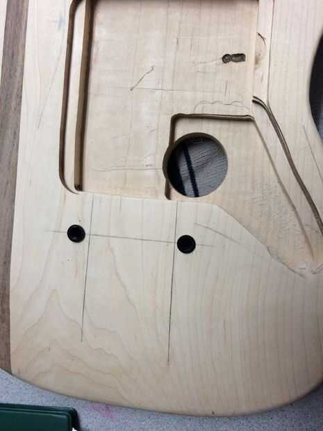 Así que para mí, esto puede o puede no haber sido la parte más estresante. Probablemente fue porque he hecho mucho ya, su marca o rotura y un largo camino hacia abajo. La posición del puente depende de la escala del cuello. Primera medida la distancia entre el traste 12 y la tuerca del cuello. El mío es 12.5" pulgadas de la tuerca hasta el traste 12, haciendo la escala 25" (doble de esa distancia). Estoy usando un puente tunomatic que me permite ajustar el ángulo y silla de montar. El puente sillas deberían ser ubicado la misma distancia desde el traste 12 ya el traste 12 se encuentra de la tuerca, así que 12.5" o 25" de la tuerca. Al medir esto, las silletas deben ser hacia adelante. Era importante empernar el cuello en primera porque ahora podemos usarlo para dibujar nuestras directrices. Utilizando una regla, trazar líneas hacia abajo cada lado del cuello, luego dibuje una línea a través de la marca de 25". El puente será más ancha que las directrices que se han acercado, debe estar centrado en las líneas de guía para que los postes deben ser iguales Distancias desde ambas líneas guía. Mi puente también me permite ajustar el ángulo del puente. Si el tuyo no lo hace, pueden guitarreros perforar puente en un desvío de 3 grados, donde el poste de la cuerda e baja es 3 grados más lejos del cuello. Mi puente es una pieza única reciclamiento de puente. A propósito elegí este puente porque es limpio, simple y permitidos para los ajustes de entonación máximo, que pensé sería crucial porque esta es mi primera vez y no quería apostar en suerte de principiantes. Si está usando un pedazo de la cola, hago algunos más investigación acerca de la ubicación de la pieza de cola. Sé que muchos guitarreros instalación cadenas y utilizarlas como una herramienta de alineación cuando realmente colocar el puente en la guitarra para estar seguro de que entonar derecho. Después de tener la ubicación exacta de donde deben ir los puestos, su tiempo para perforar. Utilizar una tarjeta de índice de taladro o pinzas para averiguar qué tamaño de bits le serán necesario para que los puestos que deslice en apretado, coloque un pedazo de cinta o ajustar el tope de profundidad del taladro para mostrar en que el agujero sea lo suficientemente profundo para los puestos. Es mejor hacer un agujero un poco más profundo que un agujero ligeramente menor. Utilizando un taladro, perfore sus postholes. Taladro agradable un poco a poco, asegúrese de que a tire de la broca hacia adentro y hacia afuera para permitir chips salir del agujero. Después se perforan los agujeros, necesitamos hacer un agujero que de dentro del bolsillo interior electrónica un acercó. Se trata de un cable que es soldado a un poste para conexiones al puente de tierra. Perforé el agujero en la parte inferior de la acercó así que no consigue en el puesto en el camino. Después de perfora el agujero, desecho de la pintura de la parte inferior de tu post y soldar el cable al poste y alimentación a través del orificio. Ahora con un mazo, martillo de los postes en los postholes. Si la colocación es correcta, el puente debe deslizarse dentro y fuera de los puestos con facilidad.