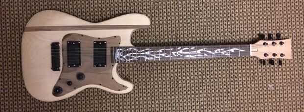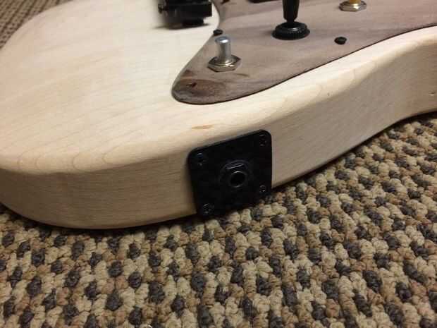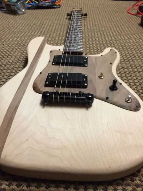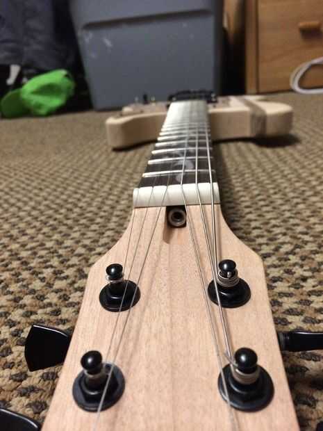 Ahora es el momento para probarlo para que podamos hacer los arreglos de última hora y cambios al diseño antes de los toques. Tornillo en la guardia de la selección y asegúrese de que utilizar agujeros! Odio admitirlo, pero agrietado mi protector de pick por que acomete a través de este proceso. Yo también avellanar sus tornillos. En estas fotos, mías no son avellanados en el protector de pick pero planeo Avellane los agujeros antes de añadir el acabado. En las teclas de sintonización en el cabezal del perno y la secuencia de la guitarra. Para entonar la guitarra, abren tune la guitarra y luego verifique si la nota es lo mismo una octava hacia abajo en el traste 12. Para ajustar, deslice las silletas del puente. También puede ajustar la acción, o la altura de las cuerdas. Para ello, es una combinación de ajustar el ángulo del cuello usando el pasador o el perno que colocamos en anteriores, la altura de la tuerca de la cadena y la altura del puente. Cambiar cualquiera de los que va a cambiar la entonación de la guitarra. Realmente sólo tomó mucho de jugar con suena bien y se intonated derecho. Yo salí mucho meneo al establecer la ubicación del puente, que facilitó el proceso. Existen numerosas guías y videos en línea acerca de cómo entonar una guitarra. Recomiendo ver un montón porque hay muchas diferentes técnicas en hacerlo. Una vez que está afinada, enchufa! Tus pastillas probablemente tienen tornillos de ajuste de altura, utilizar para ajustar el espacio entre las pastillas y las cuerdas. Es importante para asegurarse de que la guitarra está trabajando en este momento y que está satisfecho con el producto y el diseño, pero no tiene que ser absolutamente perfecto todavía. Vas a tomar aparte y tiene que repetir esencialmente este proceso después de los toques.