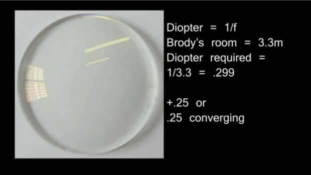 El primer paso es medir la distancia entre la ventana y la pared. Nuestra era de 3,3 metros. El objetivo que será necesario sería una longitud focal de 3,3 metros pero oculistas no utilizan longitud focal como una medida, utilizan dioptrías. El es simple a la figura hacia fuera dividiendo 1 sobre la distancia focal. Esto nos dio.299 pero estos lentes están hechos sólo en 25 pasos. Doblamos nuestra hasta.25. Si tuvieras el dióptrico exacto para la sala, la imagen sería más aguda. Fuimos al optometrista en ciudad y cuando explicamos lo que estábamos tratando de hacer, sólo nos dieron la lente. Asegúrese de que usted pida un + o una lente convergente. A - o de divergencia no funciona para esto.