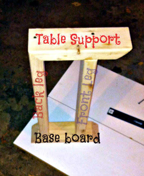 -A continuación coloque la pata delantera en el tablero de soporte (arriba). Debe haber un espacio de 4 1/2" entre la parte delantera y patas traseras.