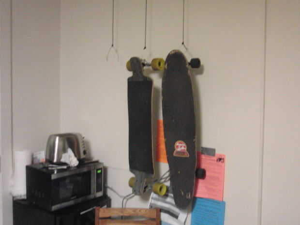 se movió en un dormitorio triple para la Universidad en la Universidad del Pacífico hace aproximadamente un mes, y en que tiempo convencido tanto mis compañeros de piso también conseguir patines para el transporte alrededor de campus. Pacífico es ideal para patinetas porque su bonito pequeño, perfectamente plana, y tiene aceras curvas agradables. El único problema era que en un dormitorio pequeño pueden tomar tres patines mucho espacio, pero estás permitido taladro ni nada fijar permanentemente a las paredes. Mi solución fue usar los materiales limitados que tenían en mano, tuve 100' de paracord y un par de perchas.