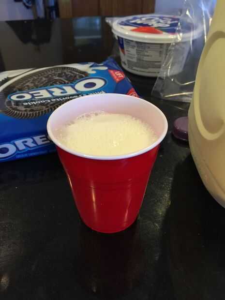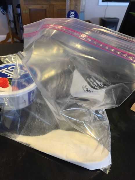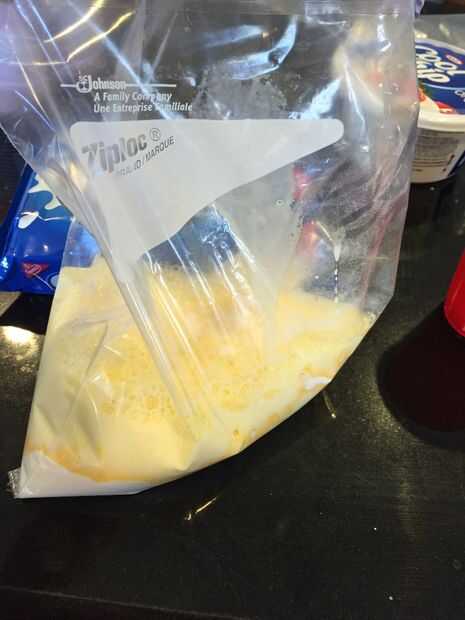 En una bolsa Ziploc combinan las cajas de pudín instantáneo y la leche. Estoy usando 9 oz la taza para que no les estoy llenando totalmente completo para una taza. (Sugerencia: 8 onzas en una taza). Cierre la bolsa y agite bien. Asegúrese de que la bolsa se sella bien. Que eso se siente y ahora vamos a utilizar la otra bolsa.