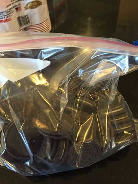 En el otro Ziploc bolsa vierte en todas las galletas Oreo. Selle la bolsa y tratar de salir todo el aire de la bolsa cuando usted sello. Ahora aplastar las galletas Oreo. Esto es cuando se necesita un libro o algo pesado. Consigue un libro de su clase menos favorita y aplastar las galletas Oreo. Tenga cuidado y no hacer un agujero en la bolsa.
