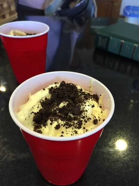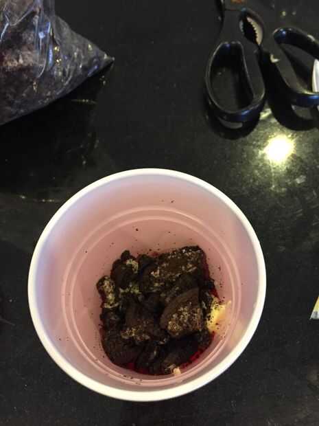 Ahora corte la parte inferior de la bolsa con leche. También cortaron la esquina de la bolsa de Oreo, esto tendrá que ser un agujero un poco más grande. Exprimir un poco de pudín en una taza y luego poner algunos de la Oreo en la parte superior, capa con más leche y Oreo más. Dependiendo del tamaño de la taza puede hacer dos o tres capas. Añadir unos sprinkles de galletas Oreo en la parte superior. Terminar con el resto de las copas. El número de tazas variará dependiendo del tamaño de la taza. Si no quieres hacer tazas puede comprar un recipiente de plástico con tapa. Si usted está haciendo antes de tiempo y no tienen espacio para las copas en la nevera, no cortar la bolsa y guarde la bolsa Ziploc en la nevera. Armar las copas cuando esté listo para ir.