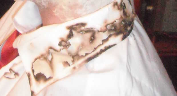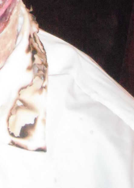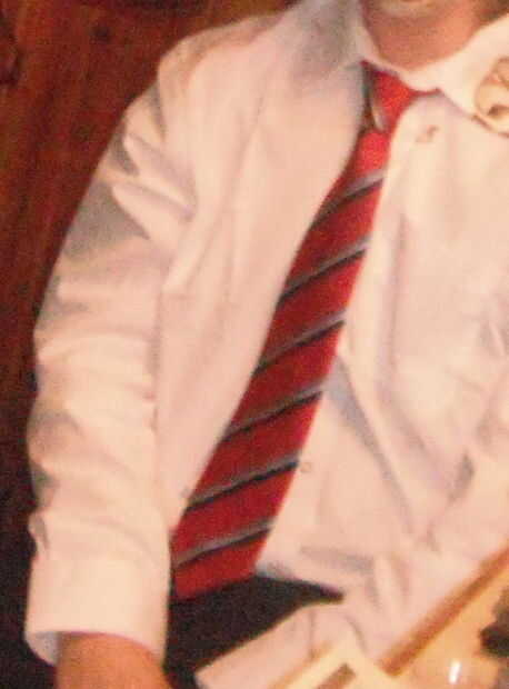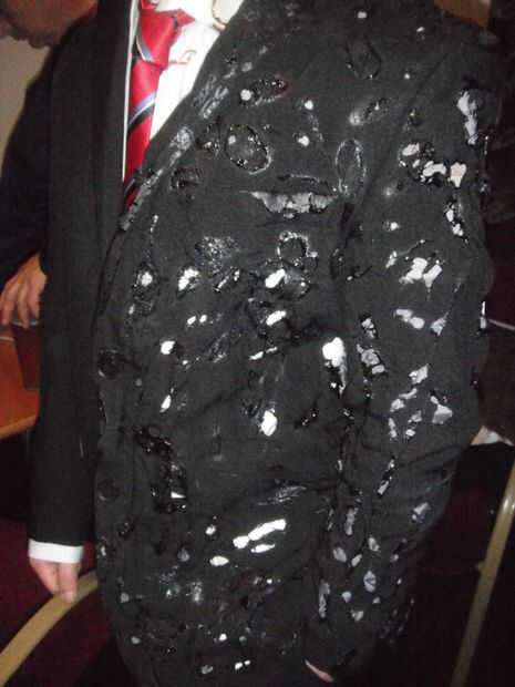 En primer lugar tomar una camisa y quemar el cuello en el lado izquierdo con un encendedor o cualquier medio (utilicé una olla pero tenga cuidado) Luego quemar el lado izquierdo de una chaqueta de traje con el mismo método como la camisa, no olvide grabar la parte de atrás para emparejar. Encontrar una corbata convenientemente coloreada (minas de primark)
