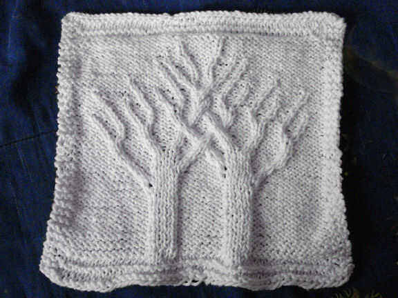 El patrón que usé fue una adaptación del patrón de Suéter de árbol de la vida en la Página Web de León marca hilo. Para hacer el árbol de diseño de una toalla (o lo que sea) usé una puntada de la Liga ribete en los lados y alternó la liga y Jersey en la parte superior e inferior.