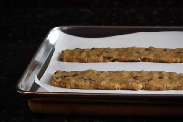 Enrolle la masa en dos panes y presionar en el molde forrado de pergamino. Presione los panes en rectángulos delgadas, un poco más de 12 pulgadas de largo. Los panes finales deben ser de una media pulgada de espesor.