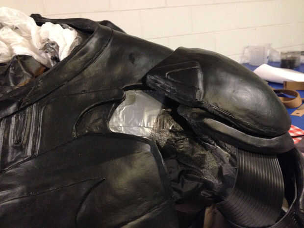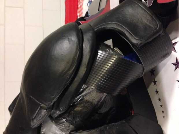 El pecho, las campanas de hombro y brazo superior Obten atados pegando sholaces en la parte inferior de las piezas y usando bandas elásticas para atarlos juntos. Van a como un par de hombreras hockey (estos no son pastillas de hockey)