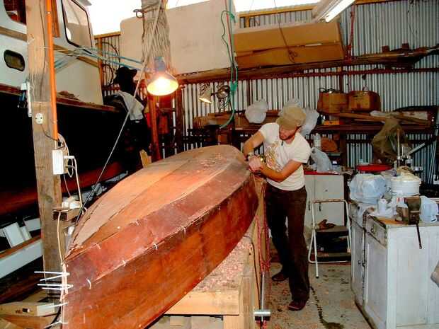Limpieza de la masilla después de quitar la cinta de Andrew. Alisar las juntas antes de la grabación final. Chorrea en el epoxi sobre las costuras de fibra de vidrio.