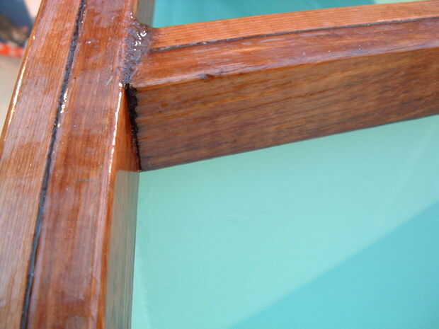 Nota la cinta de paneles de yeso de palo del uno mismo. Cuando no permanecería puesto utilicé una tira de plástico. El plástico se pegaría al epoxi y tenía generalmente suficiente adherencia para sostener la cinta indisciplinada hacia abajo. Detalle de los bordes de la madera para envases.