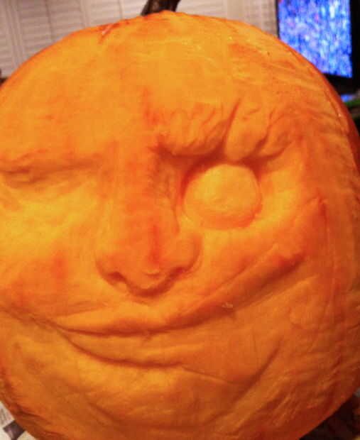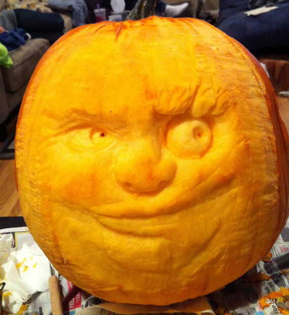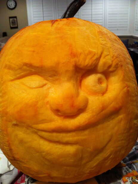 Generalmente empiezo con los ojos (ya que son la ventana al alma de la calabaza). Quería asegurarse de que realmente esto podría tirar, así que empecé con el ojo redondo más difícil primero. no tengas miedo de ir profundo (pero no demasiado profundos). Para el iris y la pupila, crear dos círculos concéntricos, con la pupila, siendo el más profundo. Mientras estoy haciendo esto, también iniciar algunas líneas alrededor de los ojos para mejorar la forma y profundidad de la talla.