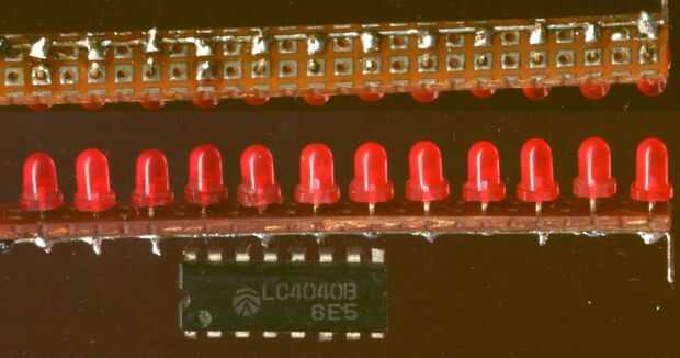 El primer paso fue que el alambre el contador y hacerlo funcionar. Redondea un número de leds rojos de 3mm de mi caja de chatarra y varios tableros y les soldados para arriba en línea en una astilla de la placa de circuito - aquí se muestra el resultado al lado del chip contador. Este particular ic fue extraído de otro medio terminar proyecto, con la ferviente esperanza de que al menos éste terminará por acabado.