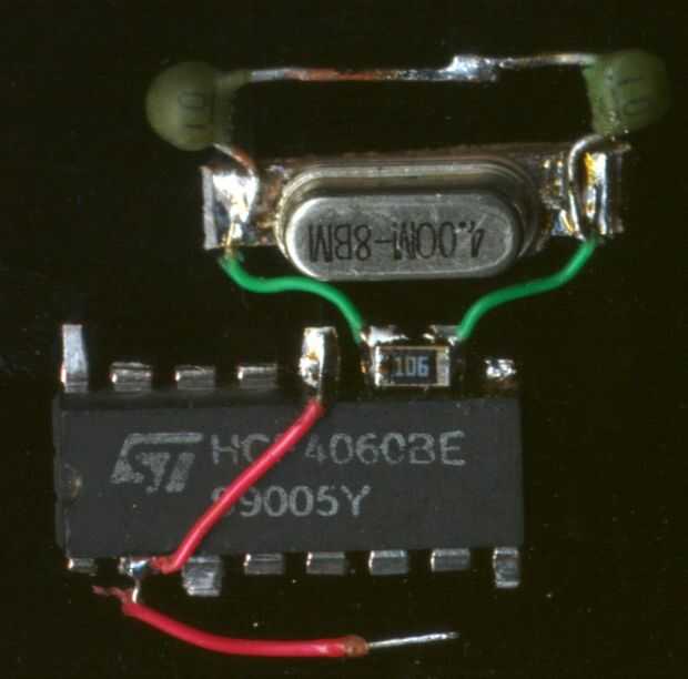 Esta es la base de tiempo completo. El cable rojo conecta a la salida más significativa (Q13) a la entrada de reset. Esto provoca un pulso de reset corto que aparezca en este pin cada 8192 vibraciones del cristal. La siguiente salida (Q12) tendrá una onda cuadrada en él, y se utiliza para habilitar el contador mientras se baja y para mostrar eso cuenta al alta.