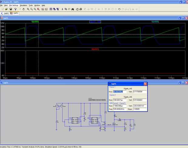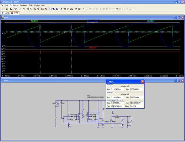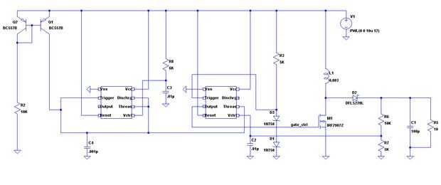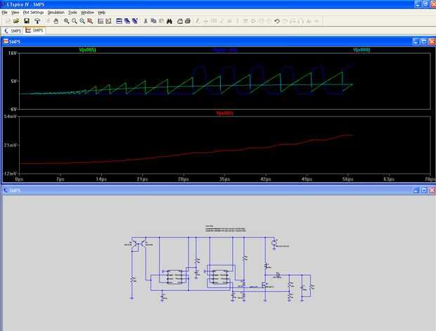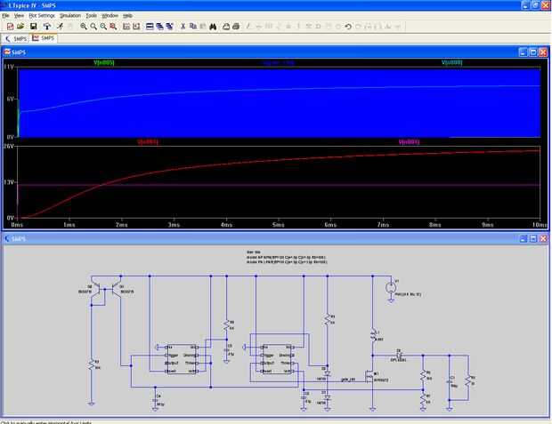 El segundo circuito contiene dos 555 temporizador chips (o uno solo 556). Su principio de trabajo está más cerca de ese impulso convertidor DC/DC que se describe en los enlaces dados antes. Aquí uno de los temporizadores se utiliza para generar una onda de triángulo (diente de sierra). El segundo realiza la función más complicada - actúa como comparador con el cierre y regulador de PWM. Como las señales de entrada para este comparador la onda del triángulo creada por el primer tiempo y parte de la tensión de salida de divisor de tensión resistivo. Para poder percibir adecuadamente que los niveles de estos dos voltajes de entrada el voltaje de referencia interno de este chip, normalmente creado por divisor de resistencia interna, es manipulado externamente por el uso de dos diodos conectados hacia adelantados (puede ser diodo zenner utiliza; Tengo 2V en la colección de mi parte, pero no he podido encontrar tal en las bibliotecas predeterminadas de LTSpice - que es la razón por la utiliza 2 diodos: D1, D3. Usando el diodo zenner sería mejor solución). Para crear una onda triangular lineal, he usado generador de corriente constante, basado en el BJT Q1 y Q2. Otras soluciones también son posibles. Se observa también que el primer temporizador tiene un circuito simple de POR (power reset) (R8, C3). Esto resuelve algunos problemas con el rebasamiento de tensión de salida. En la siguiente imágenes pueden verse cómo funciona este circuito. En el panel superior se presentan la señal de onda de triángulo (la curva verde) y la señal en la puerta del transistor de conmutación. En la parte inferior el panel es la tensión de salida. Se puede ver cómo con el aumento de la tensión de salida del ciclo de trabajo de la señal de control de la salida interruptor de cambios. Finalmente la tensión de salida alcanza el valor objetivo (en el tiempo "10 ms") y el ciclo de trabajo no cambia. Se observa que aquí las oscilaciones de la tensión de salida prácticamente no existe - la tensión de salida tiene menos ruido.