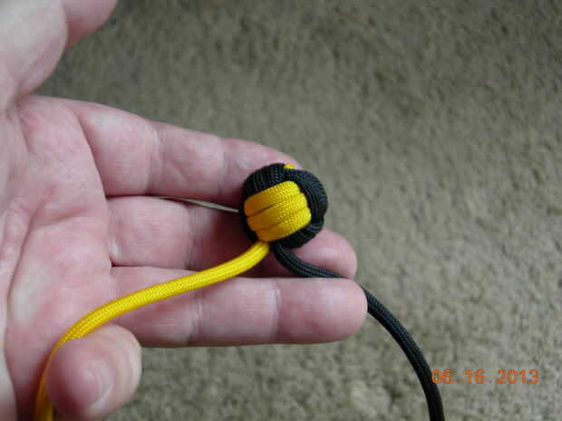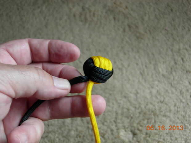 El verdadero truco para atar el puño del mono está intentando ocultar el empalme de color dentro del nudo. Tuve que empezar de nuevo un par de veces para conseguir el empalme donde yo quería. También he añadido un abrigo en el último tramo para que ambos hilos se salgan en el mismo lado. Aprendí a hacerlo después de mi primer fob vino aparte de la tensión en el lado del nudo cuando usted tira de su correa.