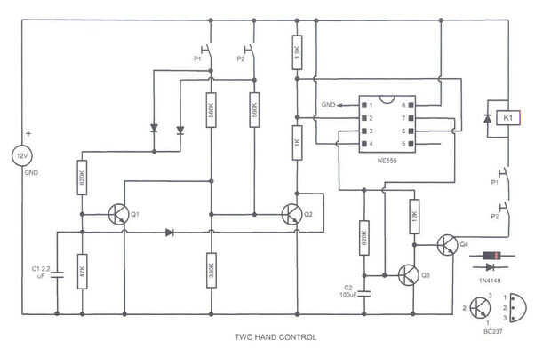 Basado en 555 que el circuito es suministrado por los 12 voltios de CC. Si se pulsan los botones al mismo tiempo el voltaje de entrada (pin 2 y 6) se baja y se activa el relé. De lo contrario el primer transistor se enciende, entonces la operación debe repetirse.