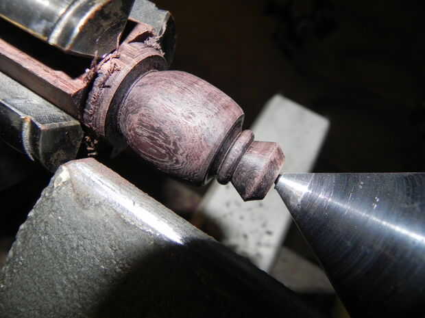 Coloque el blanco en el torno, vuelta a un cilindro y empezar desde el final de la joya. Use un raspador cuadrado o sesgar para cortar la forma de la piedra y tamaño correctamente para el mandrino. Continúe abajo el espacio en blanco y con una herramienta Sesgar o rebordear, cortar un perfil redondeado que se convertirá en el escenario.