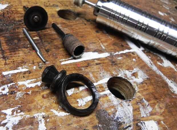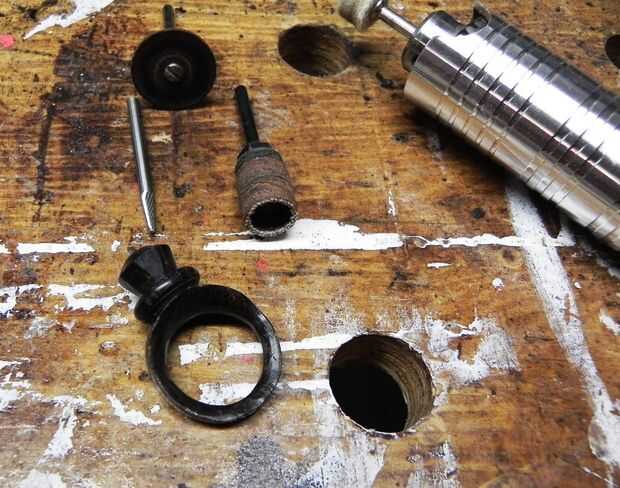 Ahora debe tener un anillo con un orificio redondeado. Utiliza un tambor de lijar que una Dremel, tallar lejos cualquier material adicional que está fuera de lugar y el tamaño del anillo de ajuste. Me aseguré de quitar todos las marcas de la Sierra de cinta en el borde.