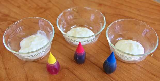 Usando una cuchara o incluso con los dedos, mezclar tus pinturas de yogur hasta que los colores son uniformes y complace con los tintes.