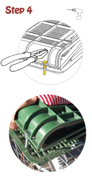 Con el fin de estabilizar el asiento, perfore dos agujeros, uno en cada lado. Coloque los tornillos y reforzarlos con las tuercas. Perfore dos agujeros adicionales en la base del cajón, lo que permite un fácil montaje del asiento.