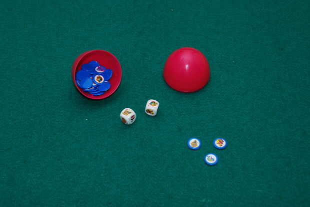 Primer jugador rodar los dados y retirarse los tokens de la coincidencia de los resultados dados; pueden ser fichas de 0 a 6. Mirada abajo *