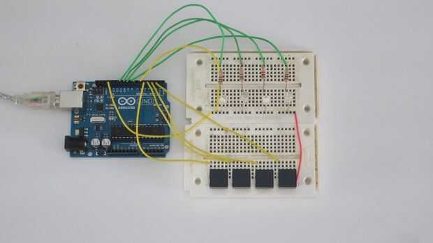Siempre es una buena idea de prototipo de un circuito en un protoboard antes de soldar juntos. Los interruptores momentáneos están conectados a pines digitales 2 a 5 y GND. Los LEDs y las resistencias están conectados a pines digitales 8 11 a y GND. El interruptor es una conexión de digital pin 6 a tierra.