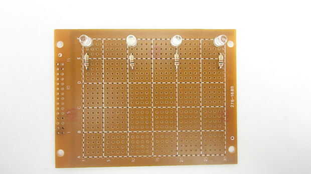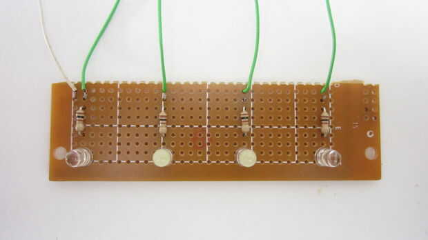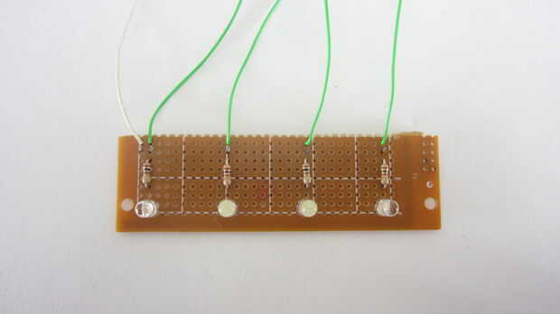 Los cuatro LEDs de la placa de circuito de la soldadura. Luego de la soldadura de las resistencias a la Junta en serie con los LEDs. Por último soldar los cables de puente a la Junta para cada uno de los LEDs y un terreno común. Después de soldar en las piezas, recortan la Junta por lo que pude caber dentro de la vivienda.