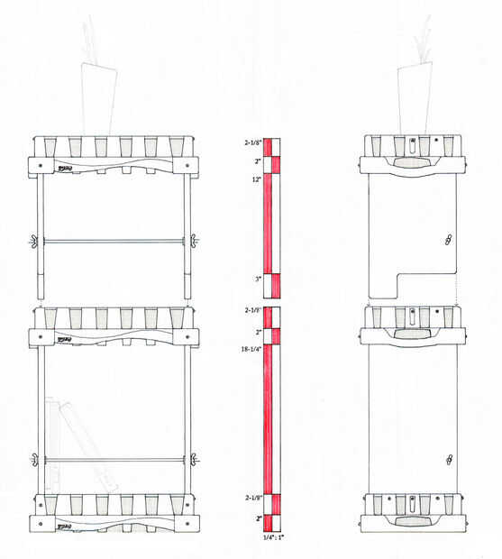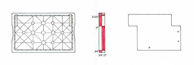 La base de los estantes es una plana que ha tenido el mango cortado al ras con el borde para que mentiría uniformemente en el piso. Entonces, dos 3-1/2" 3/4 muescas fueron cortados en la parte inferior del plano, uno a cada lado, muestran como los parches de gris en el primer dibujo. Una Dremel con un disco abrasivo metal o RotoZip funciona muy bien para cortar el plástico. Para tomar las fresas apagado, ejecutar un trozo de papel de lija de grano 100 sobre los bordes de corte.