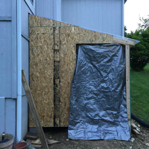 Cuando llegó el momento para añadir el revestimiento comencé desde el lado izquierdo y mi camino de la izquierda agregando pequeños trozos según sea necesario. Cada pieza fue tamaño para ajustarse a su lugar. Debido a la expansión del 50% de la nave no tenía suficiente madera para terminar enseguida esta pared o la puerta. Tuvimos lluvias muy fuertes en el pronóstico, así que hice mi mejor esfuerzo para sellar la nave hasta la lluvia pasada y pude solicitar un camión nuevo para conseguir más material. Puede que se lo pregunte que el tarp no demasiado bien contra fuertes vientos y lluvias.