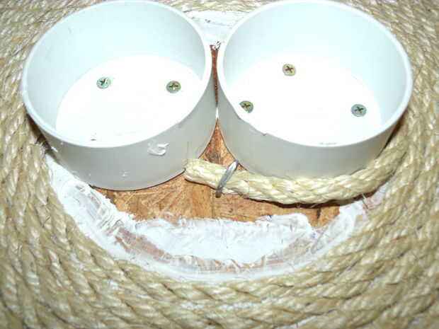 Desenvuelva algunos de su cuerda del sisal y el pegamento de construcción de la carga en la pistola para calafatear. Tornillo o grapa al final o la cuerda a la madera en el centro junto a las tapas. Exprimir una cantidad de pegamento en un patrón circular hacia fuera del centro y use la espátula para alisar hacia fuera en una capa poco profunda sobre un radio de 6 pulgadas. Empezar a enrollar la cuerda hacia abajo en un círculo alrededor del centro, asegúrese de presionar la cuerda en la cola. Agregue el pegamento a la base como usted consigue más hacia fuera y luego hacia el borde exterior de la madera.