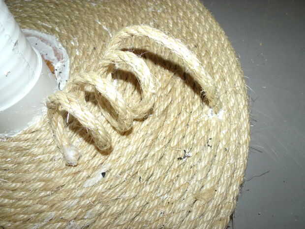 50 pies no ir por lo que se podría pensar probablemente va a necesitar iniciar una nueva cuerda un punto al enrollar la base. Opté por añadir una pequeña longitud de la cuerda en este punto que se pega hacia arriba como un juguete de juego para los gatos.