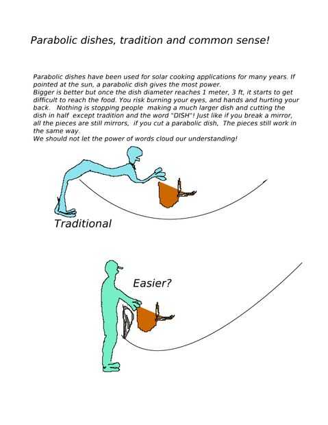 También si usted hace el plato más grande para recoger más calor, su cocinero pobre ya no puede alcanzar la olla sin extremos de postura, etc.. Scheffler platos son 2 metros cuadrados de tamaño y más grande. La mayoría otras cocinas solares parabólicas son 1 o 1,5 metros cuadrados.