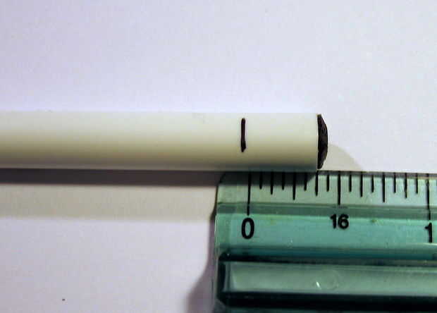 En el extremo es la tapa del extremo. La tapa es tan apretada al cañón, usted necesita cortar con una navaja o un cuchillo Xacto. Medida 3/8 de pulgada desde el borde del cañón.
