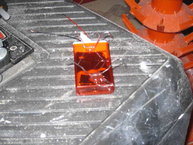 A continuación pegamento caliente las piernas y el motor al contenedor.