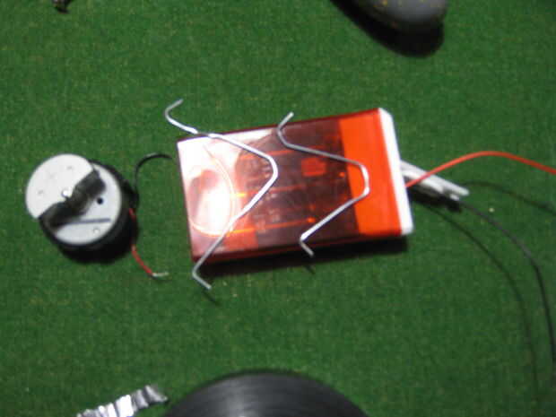 La batería en la parte inferior de la cinta y conecte los cables a él por medio de cinta aislante. Tras conectar los cables de la batería a los cables del motor (cualquier forma va a funcionar no importa que manera gira)
