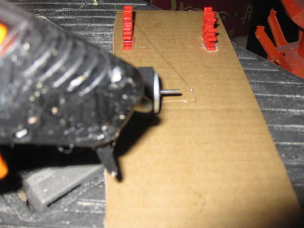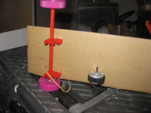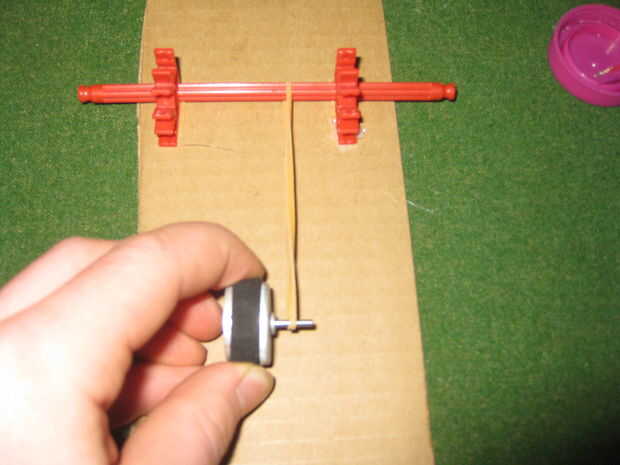 Ensayo y error para encontrar la distancia el motor debe ser del árbol de impulsión en orden para al girar las ruedas y no hasta que el elástico no hay tensión y no girar las ruedas. Este es el paso más importante, encontré que tenía que poner el motor en dos capas de cartón para las ruedas a girar también tuve que colocar una pequeña cantidad de cinta de hockey en el eje del motor para conseguir un apretón en el elástico.