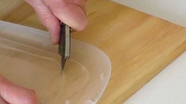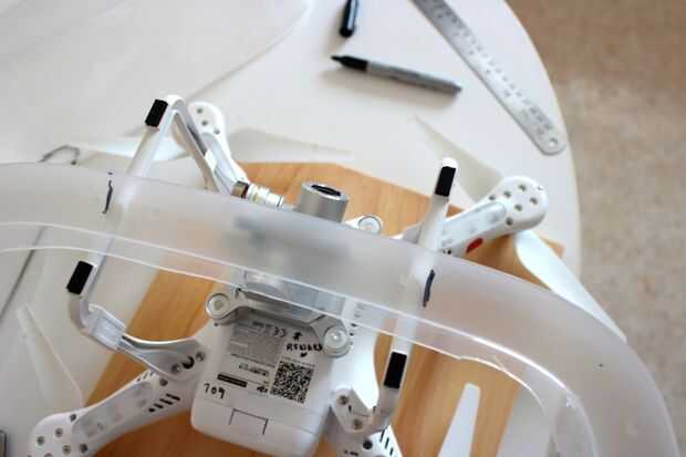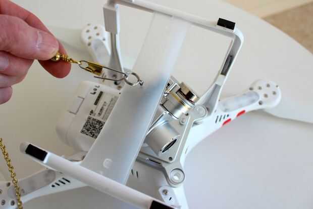 Con el cuchillo, puntuación y recorte el área central de la tapa de la caja. Esta pieza plana forma la base para apoyar la carga útil. Luego Mida y marque la longitud de la abrazadera de enlace que conecta los aviones no tripulados con el PDC. El soporte se corta de la existente zona de perímetro de la tapa de la caja. Una de las fotos muestra un soporte de enlace equipada para aviones no tripulados aire (con el eslabón giratorio y cadena atada). La longitud de la abrazadera de acoplamiento debe ser algo más larga que la distancia exterior entre las dos piernas de aterrizaje. El perfil curvado de esta parte de la tapa de la caja hace un ajuste seguro de resorte en el tren de aterrizaje cuando el soporte de enlace en el lugar. Para instalar el soporte de enlace que necesita extender el tren de aterrizaje ligeramente para permitir que el soporte de enlace entre los dos miembros de pierna horizontal del tren de aterrizaje. El aterrizaje entonces sostiene el soporte firmemente en su lugar con la acción del resorte retorno de las patas del tren de aterrizaje.