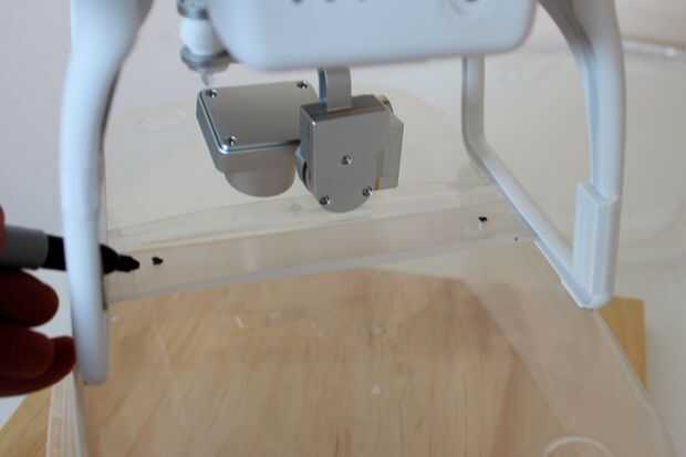 Temporalmente Instale el soporte de enlace entre el tren de aterrizaje y marcar los dos agujeros de montaje con el marcador negro. Perfore agujeros para los tornillos con una broca de 3/16 pulgada. Vuelva a instalar el soporte de enlace en el tren de aterrizaje del drone y la posición el hecho en el PDC y asegúrese de que esté centrado. Mientras sostiene el drone en lugar marca los agujeros de montaje en el PDC con el marcador, usando los agujeros realizados en el soporte de enlace como su guía. Después de taladrar los dos agujeros en el PDC instalación tornillos 10-32 en el PDC. Apretar las tuercas de buena y luego realizar una instalación de prueba de los aviones no tripulados en el PDC. El PDC está ahora asegurado en su lugar las tuercas de mariposa de 10-32 lo que es fácil de instalar y quitar como sea necesario sin necesidad de herramientas.