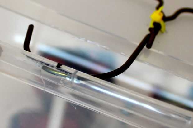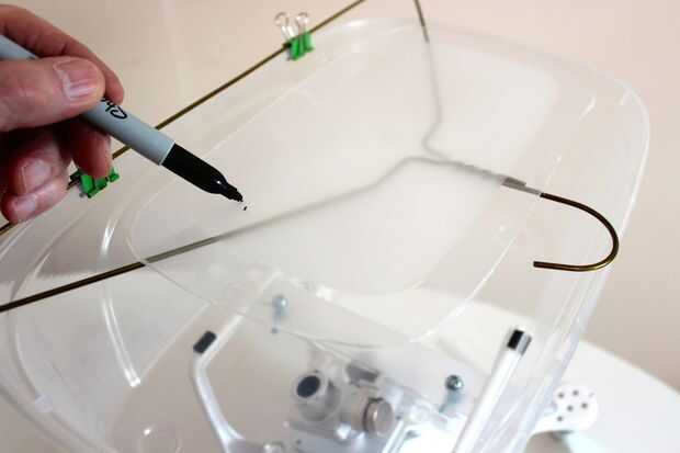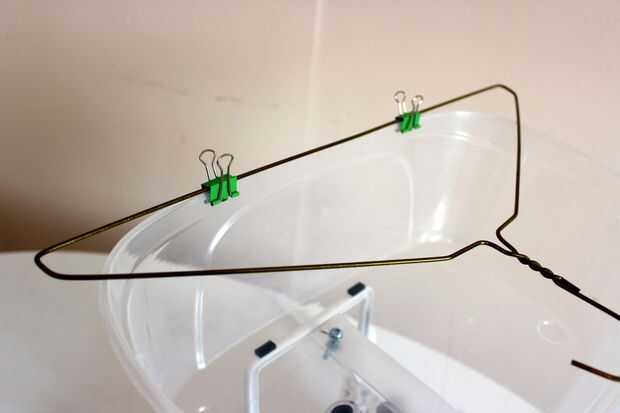 La placa de soporte de carga hecha antes de la parte superior de la caja de plástico se fija ahora a la percha de alambre con tres pequeñas abrazaderas de plástico. Para ello montar la suspensión en la caja con los dos clips de papel y luego alinee la placa en el centro del PDC. Luego marque las ubicaciones de los tres conjuntos de orificios de las abrazaderas de plástico. Después de taladrar los agujeros (un 1/8 de pulgada poco está muy bien aquí) los lazos zip instalados y ajustados.