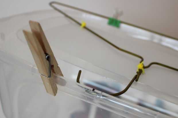 La traba para la liberación de la carga útil consiste en la parte curvada "suspensión" de la percha y una pequeña ranura rectangular en la caja de plástico. Primero marcar la ubicación de la ranura y cortar con el cuchillo. La sensibilidad del pestillo se ajusta fácilmente doblando la percha curvada hacia adentro o afuera. El gatillo es muy baja tecnología que es solo una pinza madera sujetada en el borde de la caja cerca del cierre. Ajustar la posición de la pinza para la ropa también juega un roll en la sensibilidad de la liberación de la carga útil. Planeo cambiar el gatillo en pruebas futuras. En una prueba o dos encontré que un heavy con Drone aire dos desencadenan la liberación incluso sin la pinza en su lugar. Más trabajan por hacer con esta parte del proyecto como quisiera ver un aterrizaje más controlado y desencadenar el mecanismo de liberación de la carga útil.