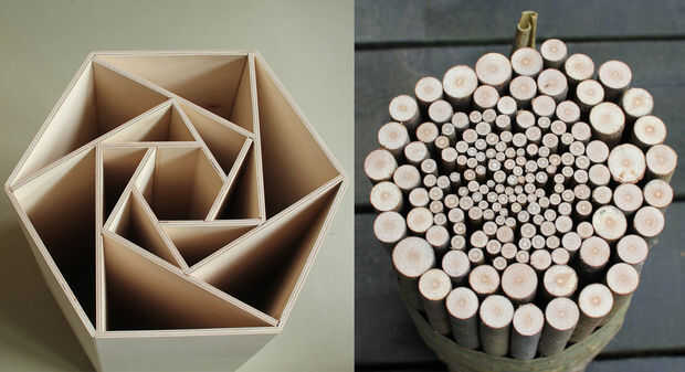 Taburete de hexágono (izquierda) fue hecha de contrachapado de abedul (6mm), sushi rodillo stool(right) de ramas de sauce y piel.