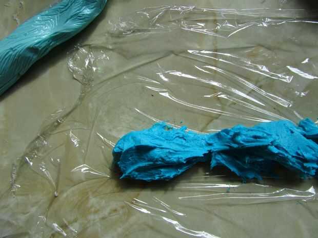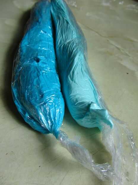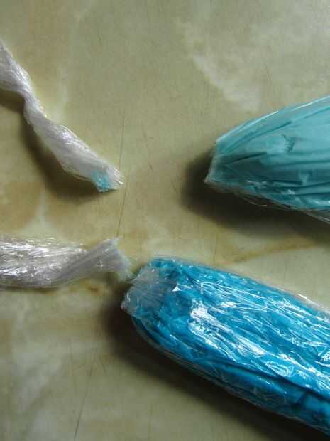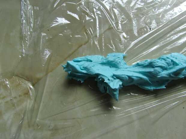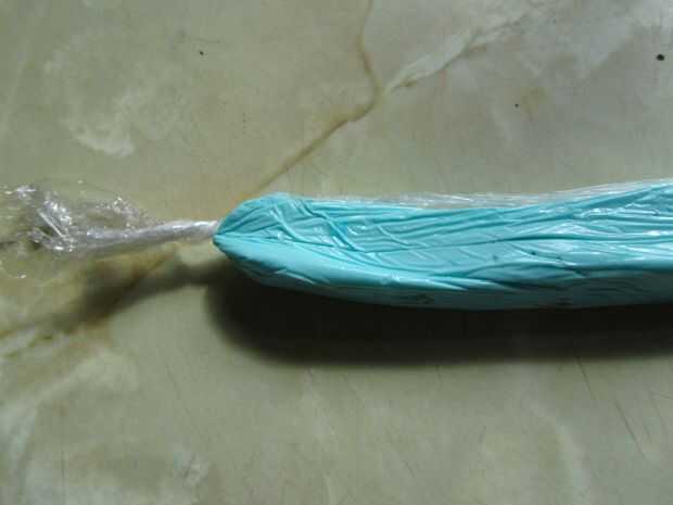 Extienda un rectángulo grande de film transparente y extendió su primer color sobre ella en una franja larga. Enrollar el film transparente para hacer una salchicha fina de glaseado. Hacer lo mismo con el otro color.
