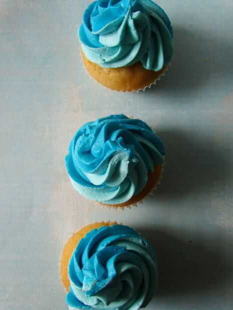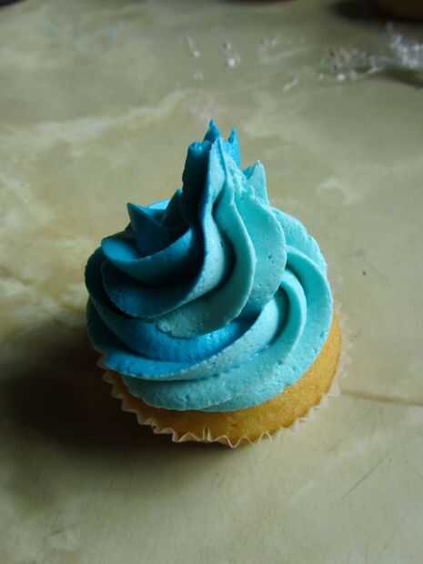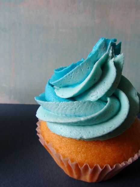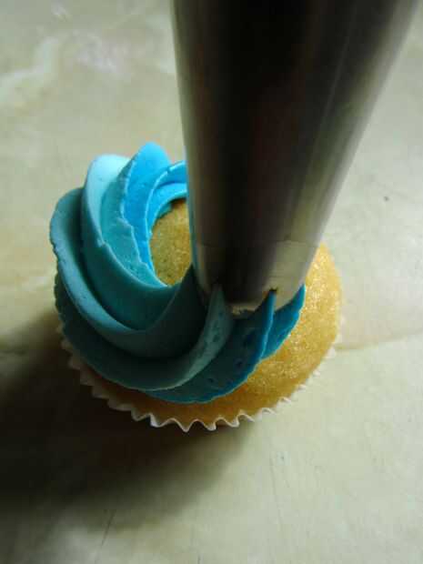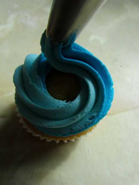Tubo un remolino dos colores en cada cupcake. Para un simple Remolino, comienzan en el borde externo de la Magdalena y exprimir el glaseado mientras lentamente torcer su muñeca contra las agujas del reloj, en el centro para rematar.