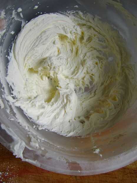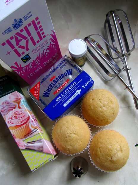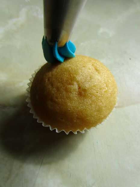 En primer lugar, hacer la crema de mantequilla. Batir junto 100 g (aprox. 1 palillo) ablandado mantequilla y 200 g (1,5 tazas) azúcar con un poco de esencia de vainilla o jugo de limón glasé hasta pálido y esponjoso. Si es demasiado duro golpe en un poco de agua, pero asegúrese de que sigue siendo lo suficientemente firme para ser conducido. Esto hace bastante tubo alto remolinos en 4 cupcakes.