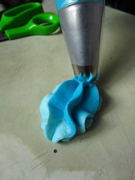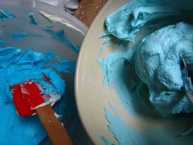 Dividir la crema en dos tazones de fuente y color de cada uno de ellos el color deseado. Estoy abrazando azul como el tema de la semana.