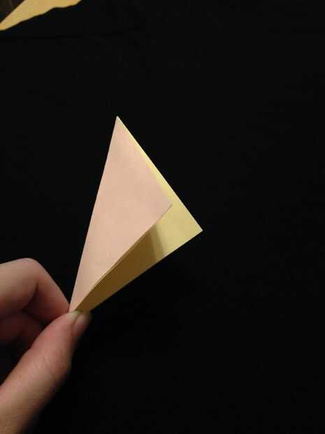 Doble el cuadrado diagonalmente. El exterior del triángulo creado será color del cuerpo del loro y el interior será el color principal. (En la plantilla, coincide con número 2 en la parte blanca dentro del doblez. El blanco será el color principal y el rojo será el color de la carrocería).