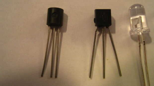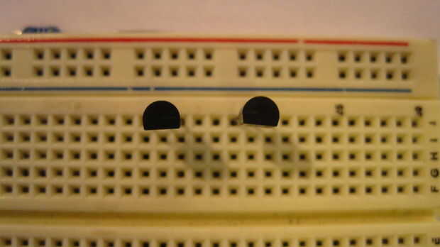 Los cables transistores eran muy juntas, así que usando alicates de punta les caben en la placa doblada. Inserte las dos filas transistores alejados uno del otro. Inserte el lado redondeado es hacia el exterior y el lado con las letras es hacia la placa.