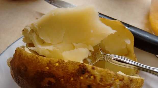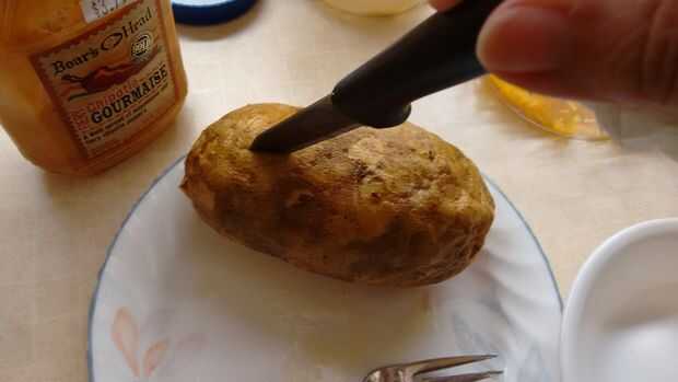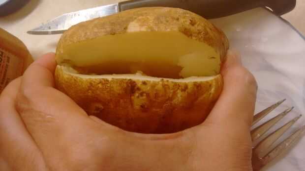 Va a ser caliente y rebanada de abrir su patata, exprimir un poco en los extremos para ayudar a perder la papa y deje para enfriar un minuto.